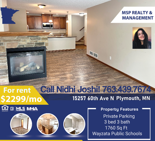 Hey there! I'm Nidhi Joshi with MSP REALTY & MANAGEMENT, and I can't wait to show you this amazing beautiful 5 bedroom rambler features updated floors, bathrooms, and newer appliances. This beautifully remodeled 3-bedroom, 3-bathroom townhome is located in the sought-after Wayzata School District. Enjoy the convenience of in-unit laundry, a spacious backyard and a two-car garage. Easy access to freeway to satisfy all your outdoor, shopping, and restaurant needs in minutes! Tenants are responsible for electricity, gas, heat, water, cable, and internet. The owner covers the association fee, which includes trash, lawn care, and snow removal. Available for a 12- or 24-month lease.